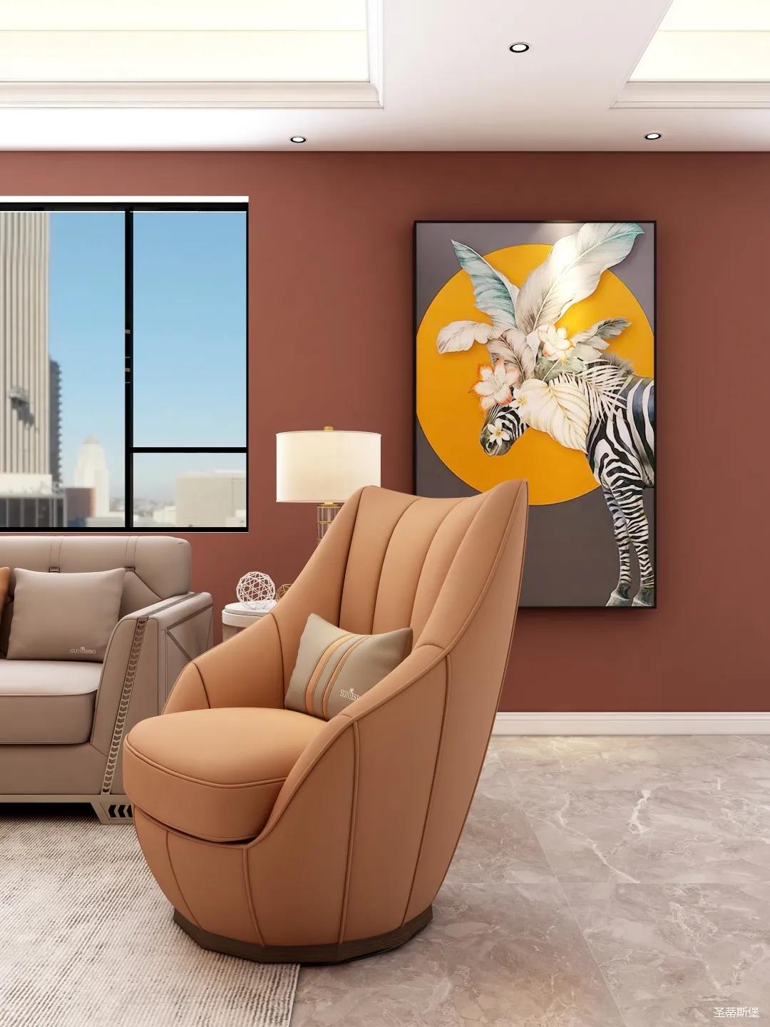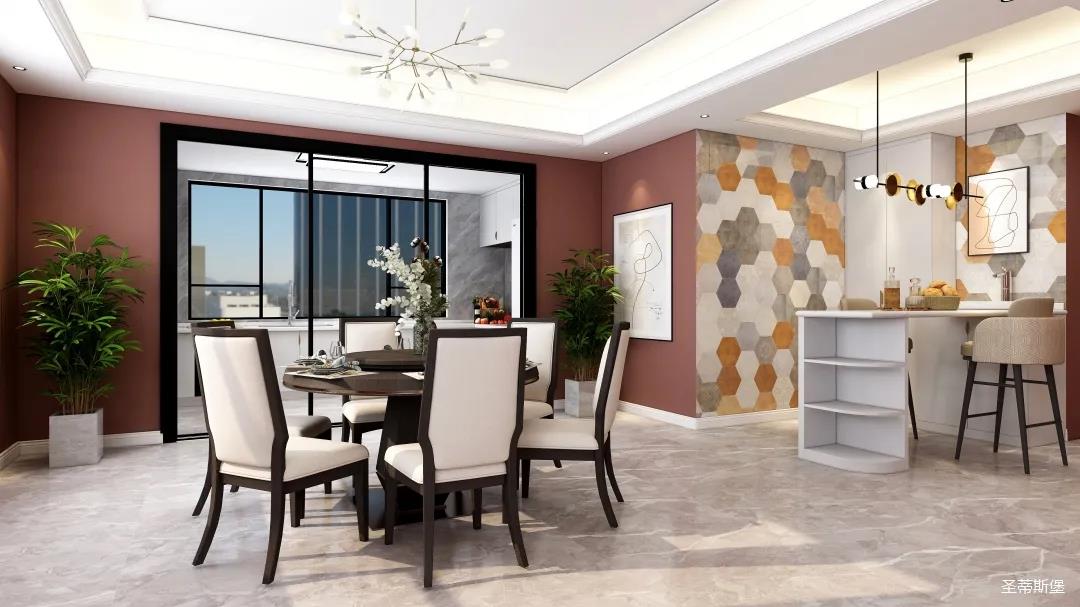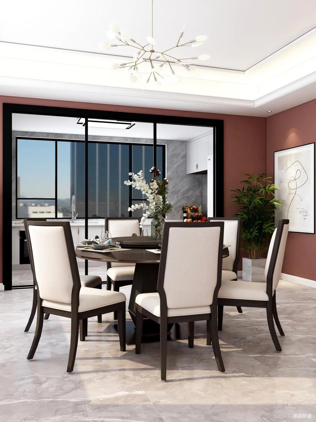 表姐不喜歡大白墻設計,于是設計師完美貼合表姐的喜好,摒棄了傳統的大白墻,將色彩跳躍的鐵銹紅應用于空間,從視覺上豐富了空間的層次感。南北通透的空間布局,讓視野更為清透明亮。