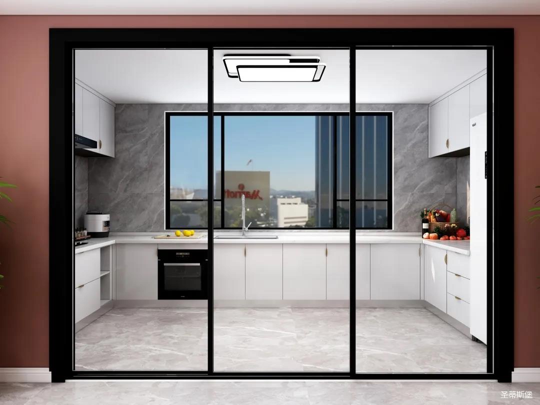 廚房是南北通透的U型空間布局,功能齊全且合理銜接,純白的柜體讓視野更開闊,用透明玻璃門隔斷,極大的提升了生活的品質。