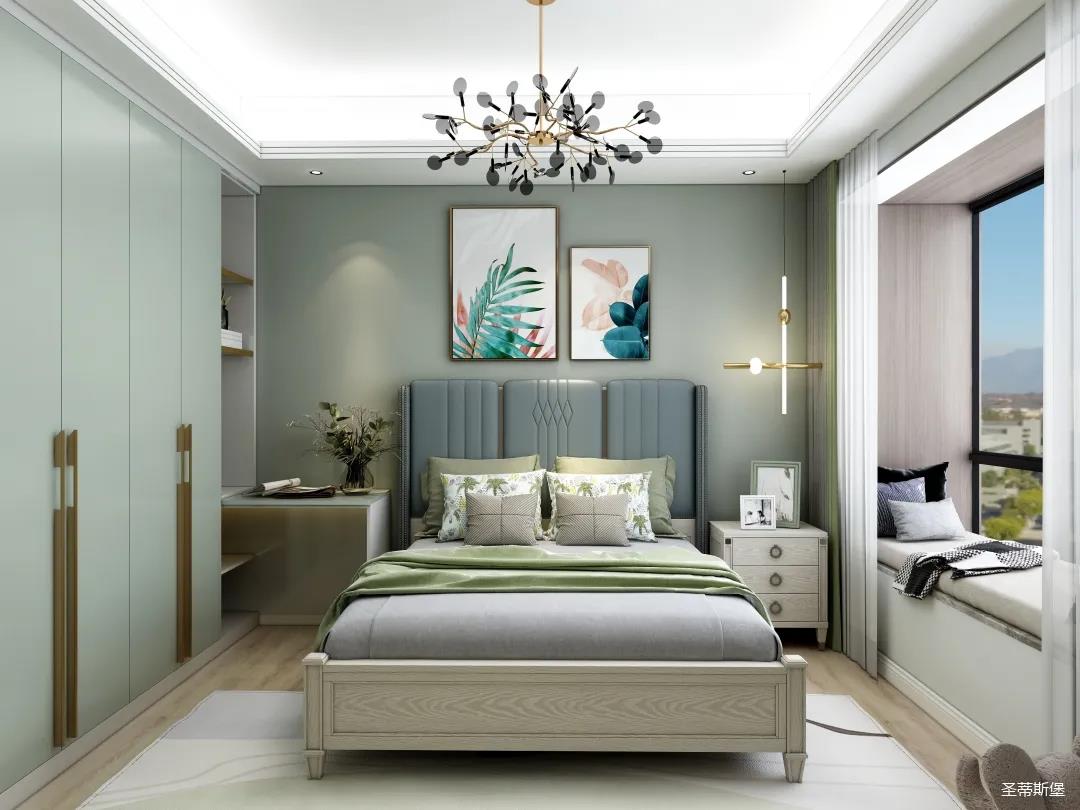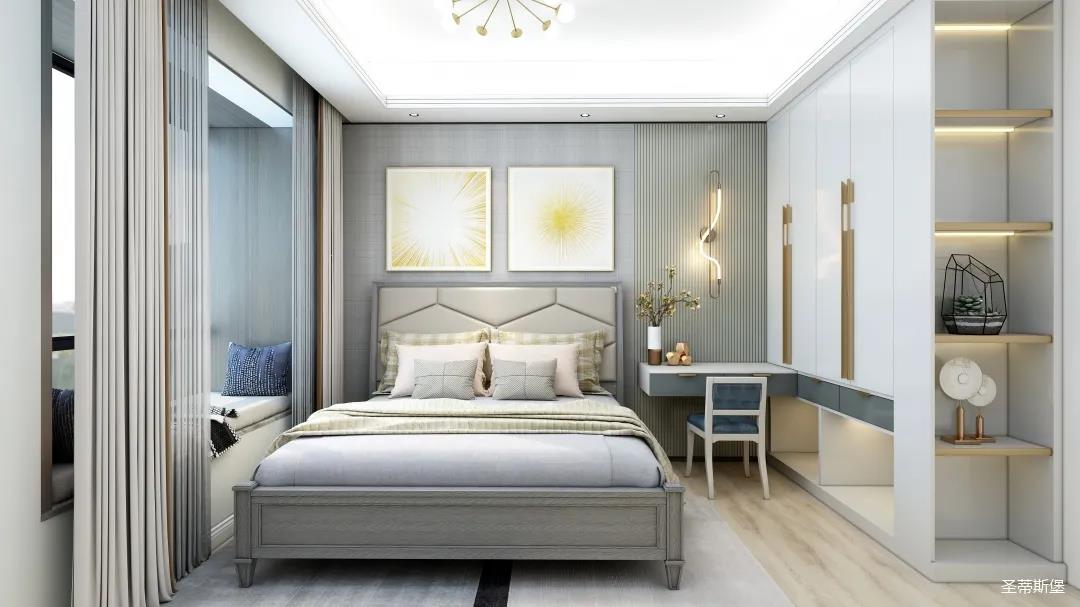 次臥的設計充滿治愈氣息,表姐打算讓兩位老人居住。莫蘭迪灰的實木感經典再現,沉穩中透著時尚,流露出精致的美式格調。舍棄刻意繁復的設計,簡約米白背景墻與床屏產生的視覺延伸,提升了空間的舒展性。金屬材質的燈飾,以較強的白熾燈為主,輔助照明,將對兩位老人的關愛體現在細節中。