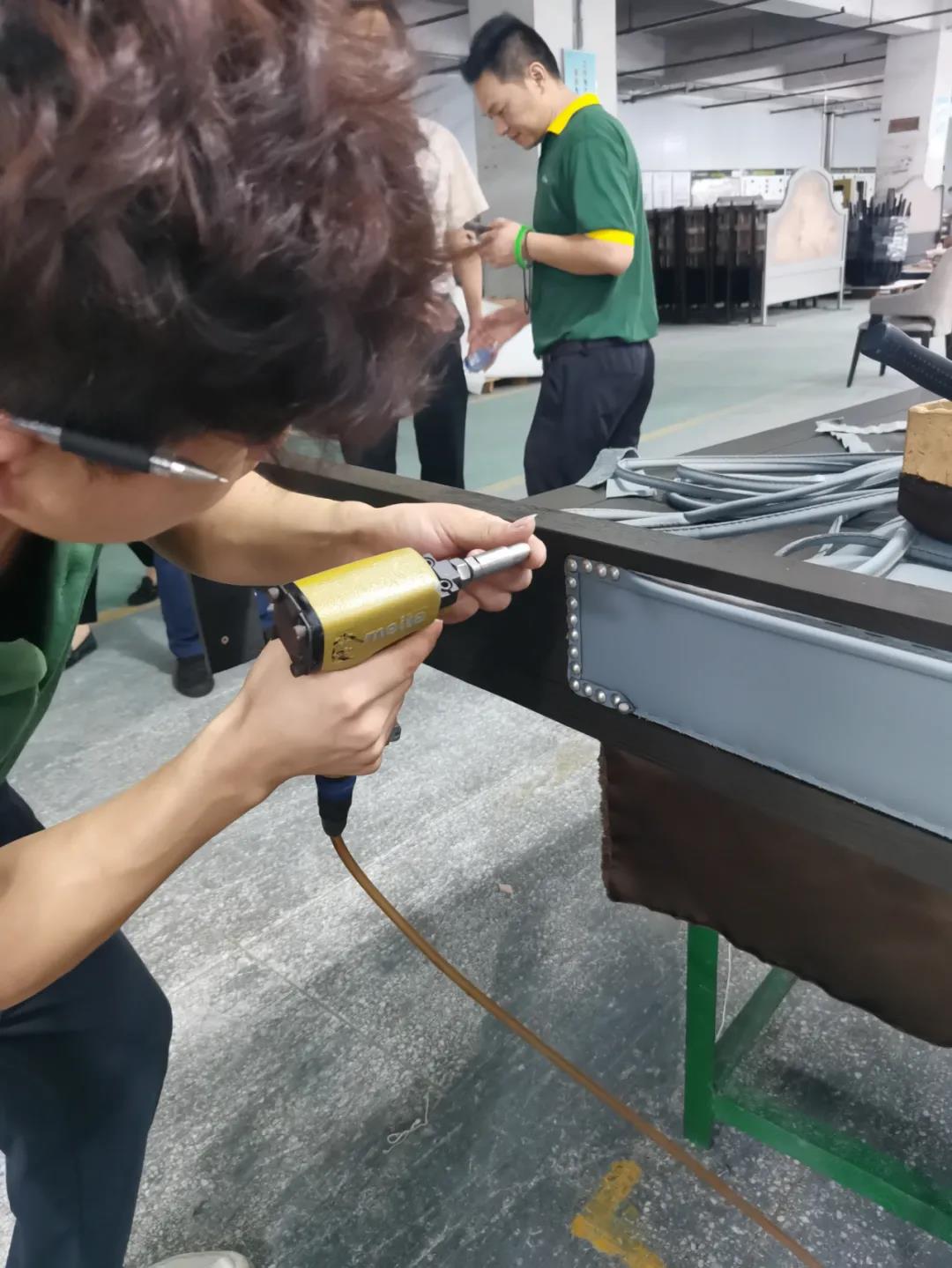 本屆技能競(jìng)賽設(shè)置為工業(yè)組和商業(yè)組,共設(shè)競(jìng)賽項(xiàng)目8項(xiàng),其中,工業(yè)組競(jìng)賽包含了打滾邊、打銅釘、自身產(chǎn)品組裝、成品組裝、柜體噴底色、修色、板材開(kāi)料等七大細(xì)項(xiàng)。商業(yè)組以組裝辦公臺(tái)、床頭柜為主。